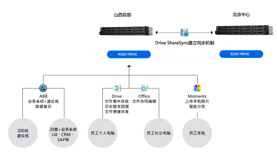 一份備份數(shù)據(jù)對公司的安全需求來說還不夠,借用群暉又進一步打造了異地備份容災方案。振東制藥山西總部的 RS3617RPXS 的備份數(shù)據(jù),通過群暉 Drive ShareSync多分點同步功能復制到北京分公司的 RS3617RPXS 中。支持排程備份計劃。