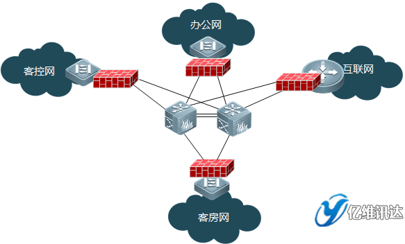通過銳捷核心交換機(jī)的防火墻模塊的虛擬防火墻功能,對(duì)客控網(wǎng)、客房網(wǎng)、辦公網(wǎng)進(jìn)行安全防護(hù),將病毒/攻擊隔離在本地,不影響其他區(qū)塊正常運(yùn)行。