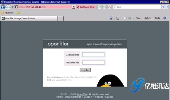 當(dāng) Openfiler 系統(tǒng)安裝并重啟完成后,對(duì)系統(tǒng)所有后續(xù)的配置過(guò)程,都是以 Web 方式配置完成的。這種全部基于 Web 的系統(tǒng)配置方式,使得配置過(guò)程變得更加簡(jiǎn)易,同時(shí)也帶來(lái)了良好的用戶體驗(yàn)。首先打開(kāi)瀏覽器,輸入地址:https://IP:446。注意,此處輸入的 IP 地址為在系統(tǒng)安裝時(shí)所配置的固定 IP 地址。然后使用系統(tǒng)初始默認(rèn)的用戶名和密碼進(jìn)行登陸。用戶名為 openfiler,密碼為 password。系統(tǒng)初始的用戶名和密碼可以在第一次登入系統(tǒng)后進(jìn)行重新設(shè)置。如圖所示。