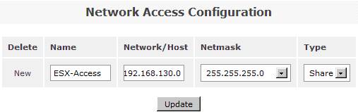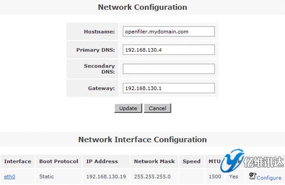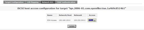 在系統(tǒng)菜單“System”菜單下的“Network Access Configuration”區(qū)域,配置允許訪問(wèn) Openfiler 系統(tǒng)的安全訪問(wèn)控制列表。值得注意的是只有加入到 Openfiler 的網(wǎng)絡(luò)訪問(wèn)控制列表中的網(wǎng)絡(luò)或者主機(jī)地址,才允許訪問(wèn) Openfiler 系統(tǒng)所提供的虛擬存儲(chǔ)服務(wù)。在網(wǎng)絡(luò)訪問(wèn)控制列表中,既可以配置網(wǎng)段地址也可以配置單個(gè)主機(jī)地址。在本例填入 192.168.130.0 網(wǎng)段,設(shè)置類(lèi)型為“Share”方式,添加完成后點(diǎn)擊“Update”完成系統(tǒng)配置更新。如圖