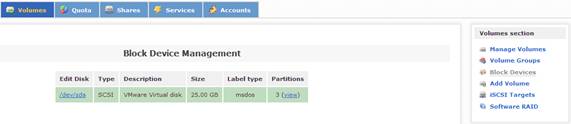 當(dāng)配置好系統(tǒng)的安全訪問(wèn)控制后,接下來(lái)的一步是配置系統(tǒng)磁盤(pán),實(shí)現(xiàn)虛擬存儲(chǔ)服務(wù)。在 Openfiler 中,有三類(lèi)存儲(chǔ)概念:Block Device,Physical Volume 和 Volume Group。其中,Block Device 表示的是實(shí)際的物理磁盤(pán);Physical Volume 表示的是物理磁盤(pán)的分區(qū),它是組成 Volume Group 的單元;Volume Group 則是由一個(gè)或多個(gè)物理磁盤(pán)分區(qū)(Physical Volume)組成,它又是組成 Logical Volume 的單元。
