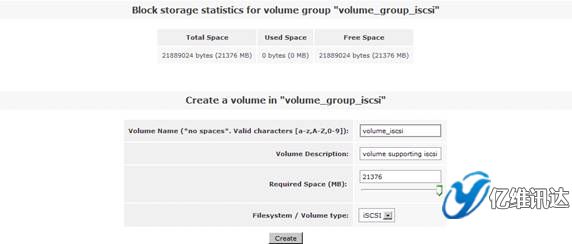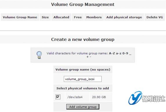 接著在右側(cè)的“Volumes section”區(qū)域選擇“Volume Groups”來(lái)創(chuàng)建一個(gè)卷組。在區(qū)域“Create a new volume group”處填寫(xiě)卷組 volume group 的名稱(chēng)為“volume_group_iscsi”,同時(shí)勾選剛剛在上一步所創(chuàng)建的物理卷 /dev/sda4,最后點(diǎn)擊“Add volume group”。如圖