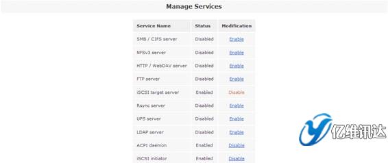 當(dāng) iSCSI 卷創(chuàng)建完成后,接下來(lái)是開(kāi)啟“iSCSI target server”系統(tǒng)服務(wù)。點(diǎn)擊“Services”菜單,在右側(cè)的“Services section”區(qū)域選擇“Manage Services”。然后將系統(tǒng)服務(wù)列表中的“iSCSI target server”設(shè)置為“Enabled”狀態(tài),從而使得系統(tǒng)能夠?qū)ν馓峁┗?iSCSI 協(xié)議的虛擬存儲(chǔ)服務(wù)。如圖