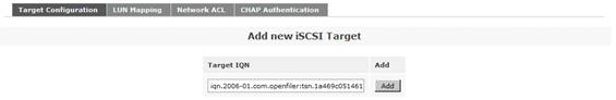 接下來(lái)是添加一個(gè) iSCSI Target。首先點(diǎn)擊菜單“Volumes”,然后在右側(cè)的“Volumes section”區(qū)域中選擇“iSCSI Targets”。在“Target Configuration”子菜單中的“Add new iSCSI Target”區(qū)域,選擇列出的“Target IQN”。最后點(diǎn)擊“Add”按鈕,從而添加了一個(gè) iSCSI Target。注意,此處的 Target IQN 信息在后面的對(duì) ESX 服務(wù)器的存儲(chǔ)配置過(guò)程中會(huì)用到。如圖
